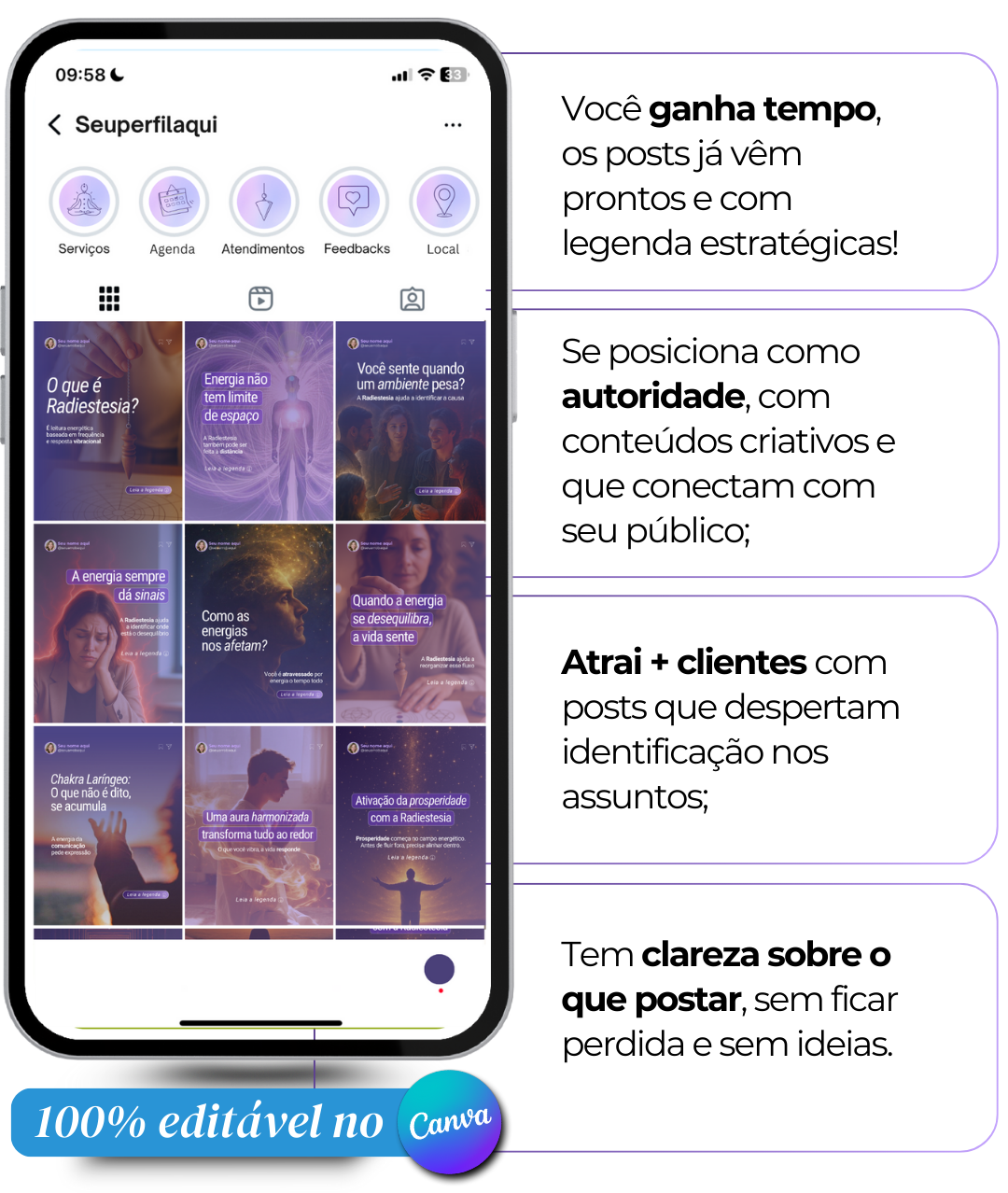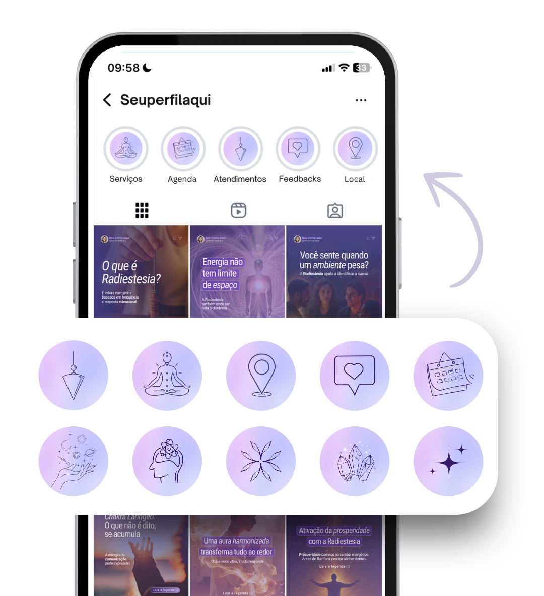 Por isso o Pack de Posts Premium Radiestesia é a solução mais prática e completa para ter um perfil bonito, organizado e que conecta.